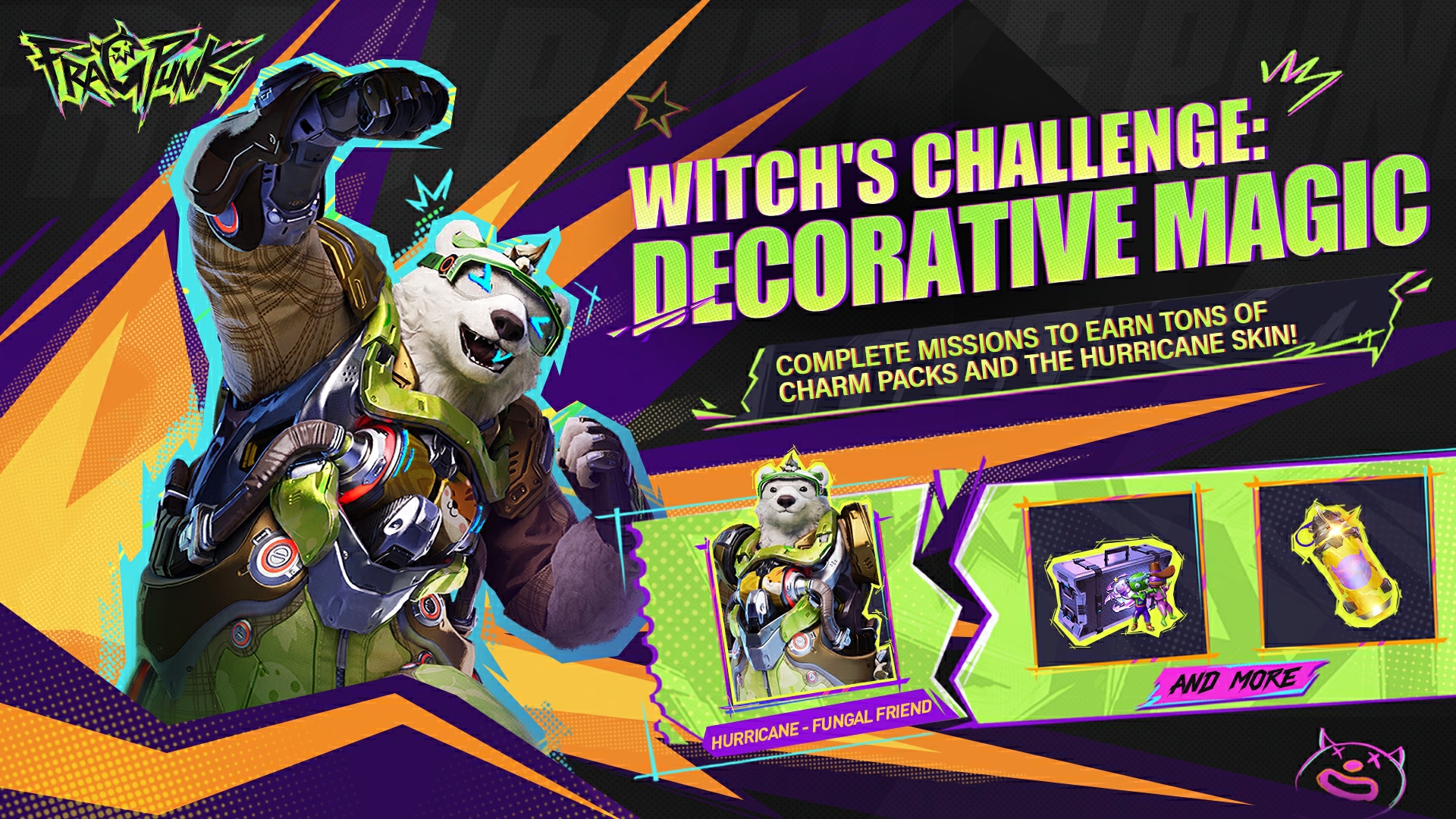 L'evento “Witch's Challenge: Decorative Magic” sarà disponibile dal 6 novembre. Goditi i regali della strega! Completa le sfide per ottenere ricompense, tra cui la skin Hurricane - Fungal Friend skin, 5 Witch Moon: Decoration Pack, 3 Witch Moon - Sticker Pack, 3 Basic Sticker Pack, 1 Ultra Can e 400 Glunite Coins!